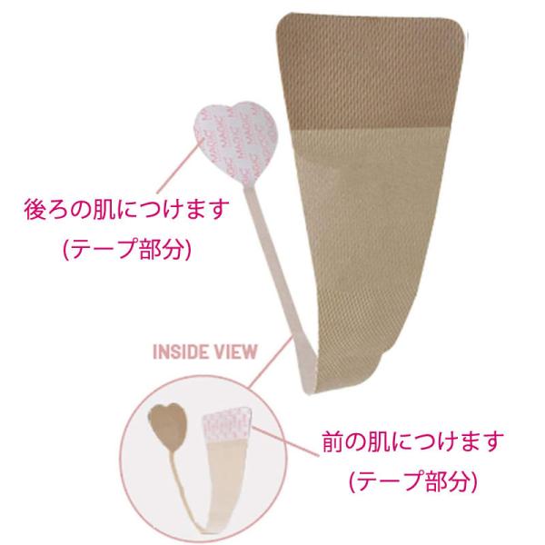粘着テープ式。正面(上辺)と後ろ(ハート部分)に皮膚に付けられる仕様です。