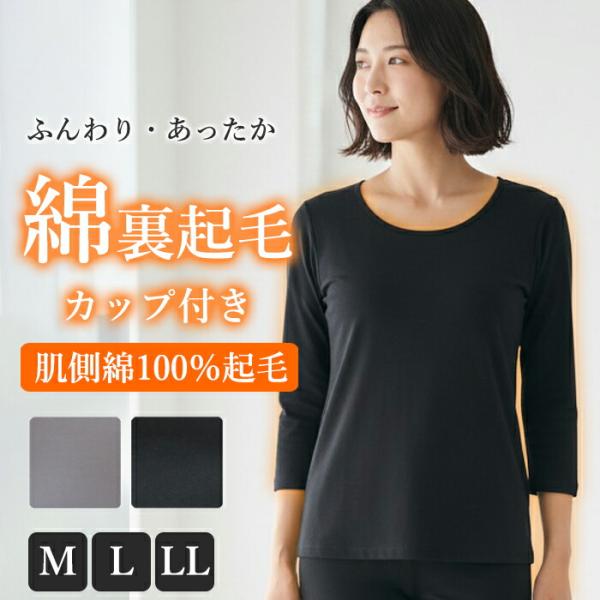綿100%裏起毛あったかカップ付きインナー カップ付き 長袖 長袖 裏起毛 ブラトップ トップス 8分袖 厚手 肌着 下着 1メ-2運 5621 【N】