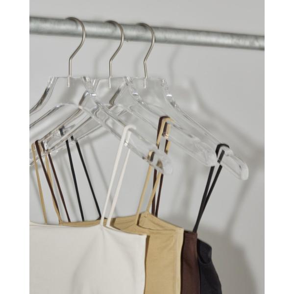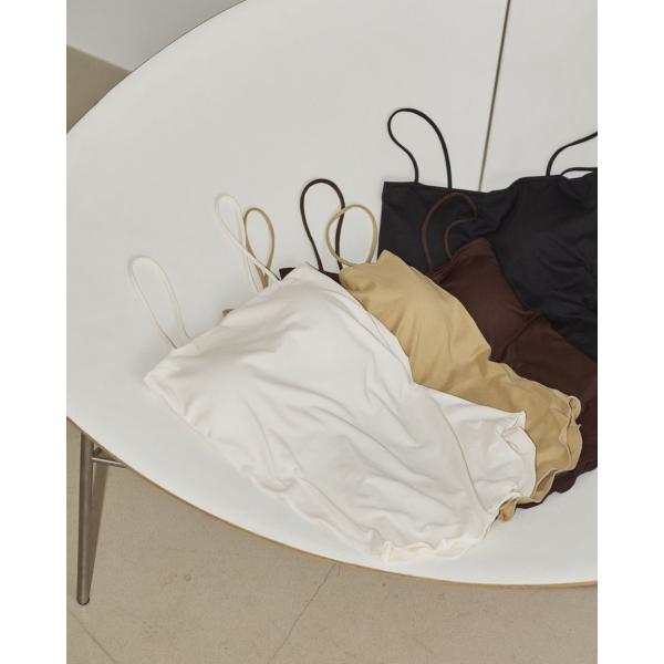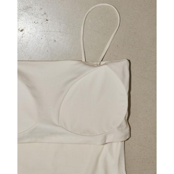 上品な光沢があり肌触りの良いカットソー生地を使用したキャミソール。トップスにラインが響きにくいすっきりとしたシルエットが魅力の一枚。華奢なストラップと直線的なネックラインはヘルシーな印象に。透け感のあるトップスや背中のあいたワンピース等のインナーにおすすめです。パットは縫い付けてあります。