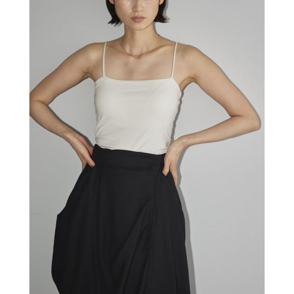 上品な光沢があり肌触りのいいカットソー生地を使用したキャミソール。トップスにラインが響きにくいすっきりとしたシルエットが魅力の一枚。華奢なストラップと直線的なネックラインはヘルシーな印象に。透け感のあるトップスや背中のあいたワンピース等のインナーにおすすめです。パットは縫いつけてあります。