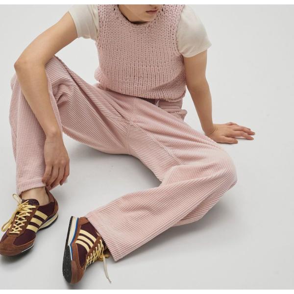 国内生地を使用した、太めの縦ラインが特徴のコーデュロイパンツ。柔らかく落ち感のある生地で、腰まわりをすっきりと見せつつ、ほどよくゆとりのあるシルエットが脚をきれいに演出してくれます。シンプルなトップスを合わせるだけでもスタイリングが決まり、シーズンムードを高めてくれる一本です。
