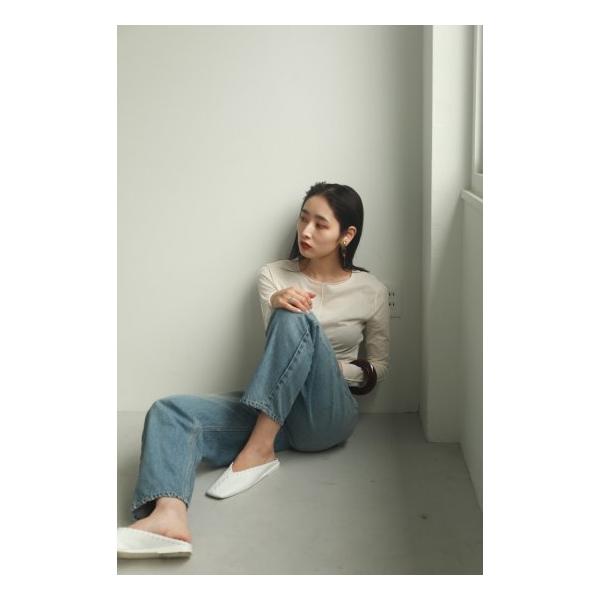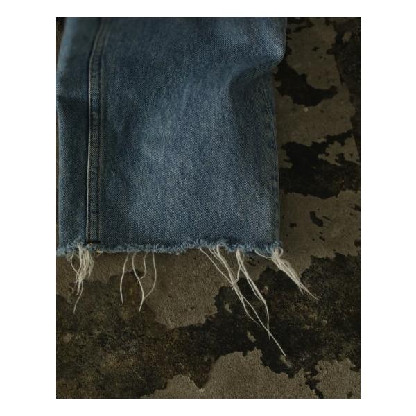 古着のような風合いのデニムは1年中履いていただける中間色のブルーが魅力。裾は断ち切りで履いていくうちに雰囲気が出ます。ハイウエストで脚長効果も期待できます。ヒールを合わせて女性らしい着こなしがおすすめです。