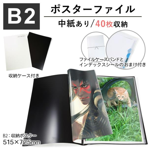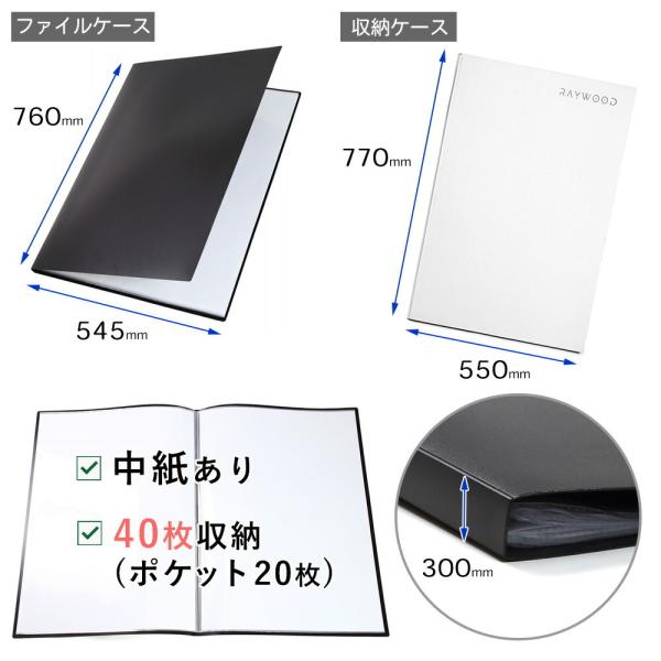 RAYWOOD B2 ポスターファイル ケース 中紙あり 保管用収納ケース付き リフィル クリアポケット 保存 コレクション (ブラック 40枚)