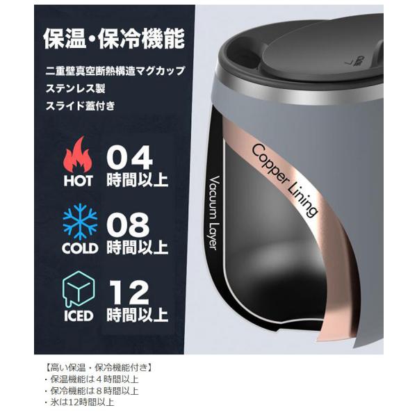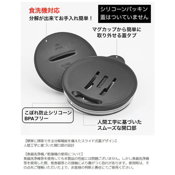【優れたスライド蓋 】ユニークなスライド蓋は指1本で簡単に開閉できます。 スライド蓋は、シリコン製の O リングによって密閉するため、こぼれにくく持ち運びが容易で、マグカップ内の温度を維持します。このスライド蓋は食器洗い機対応で、簡単に掃除できるように分解できます。 交換用のスライド蓋もご用意しております。