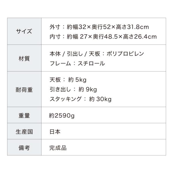 耐荷重:天板/5kg 引出し/9kg スタッキング/最大約30kg