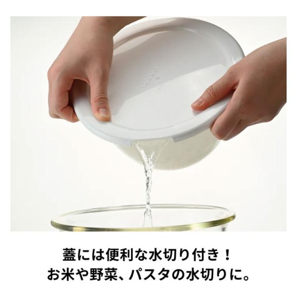 フタの左右に水切り口付き!お米やパスタなどの食材も水切りできます。ボウルにフタをセットして電子レンジOK。ラップ不要で調理・下ごしらえ・保存ができ、食器としてもお使いいただけます。フタをしたままレンジ・積み重ねOK