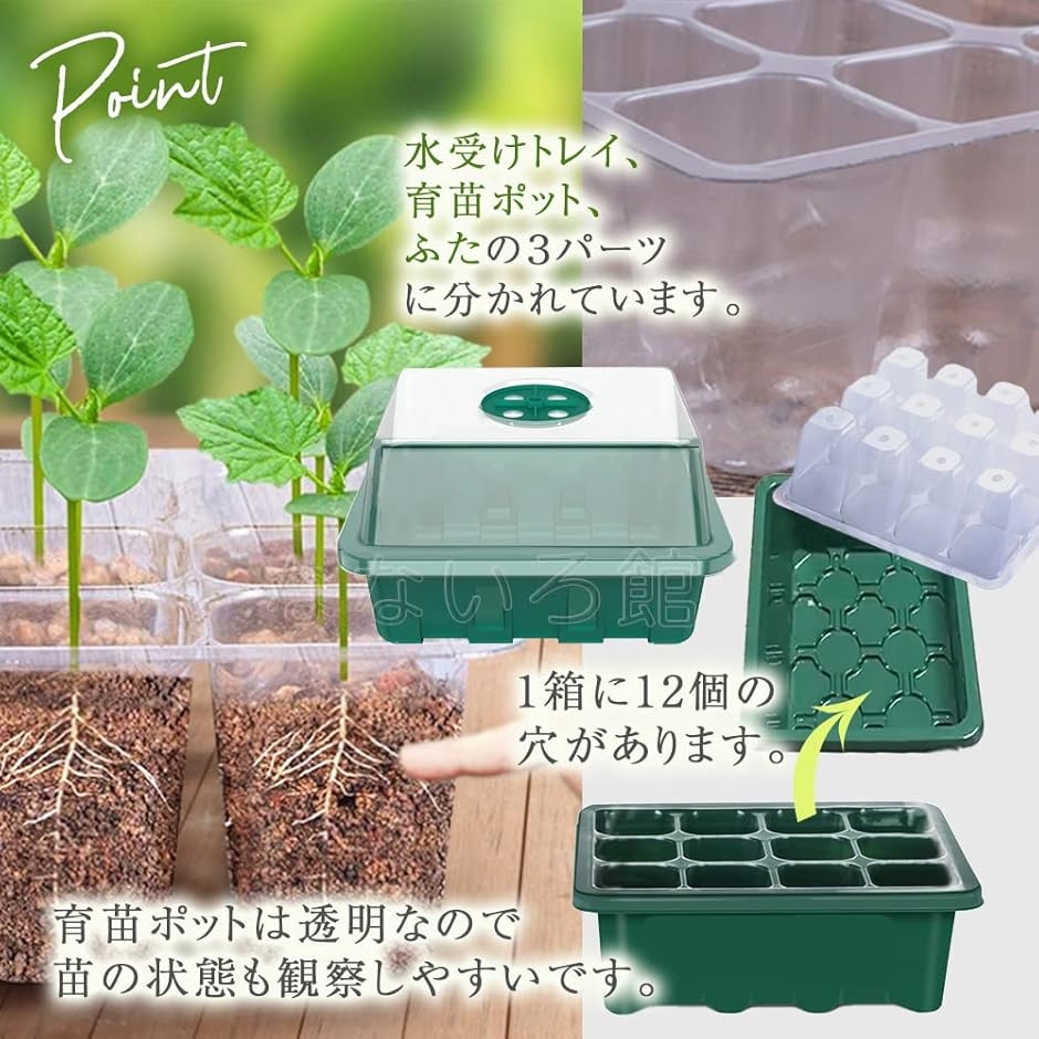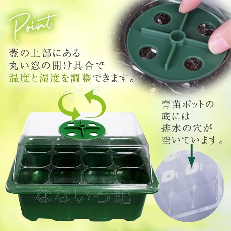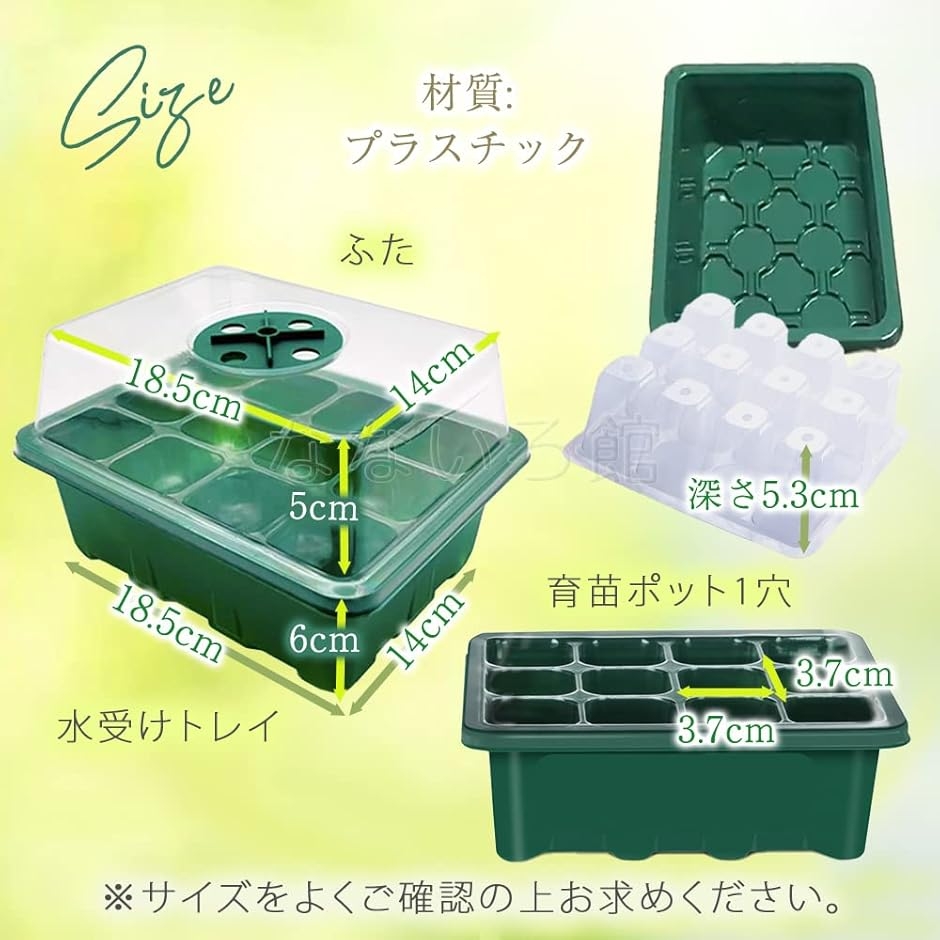 ・「サイズ」 水受けトレイ:横18.5cm 縦14cm 高さ6cm 育苗ポット1穴:横3.7cm 縦3.7cm 深さ5.3cm ふた:横18.5cm 縦14cm 高さ5cm *サイズをよくご確認の上お求めください。
