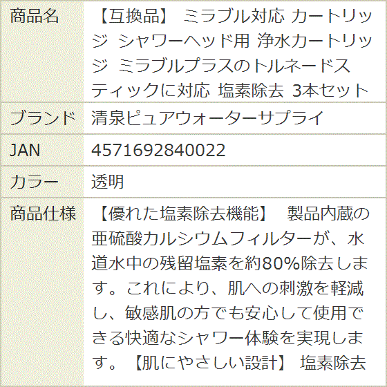 【互換品】 ミラブル対応 カートリッジ シャワーヘッド用 浄水カートリッジ ミラブルプラスのトルネードスティックに対応 塩素除去 (透明)