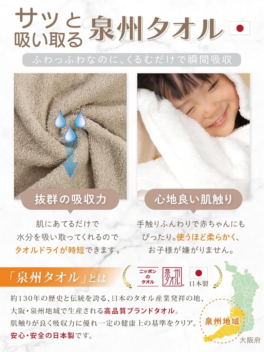 「高級ブランドタオル」泉州タオルは日本のタオル産業発祥の地である大阪泉州地域で約130年の歴史があり、特徴としては「吸水性」「安全清潔」「ふわふわな肌触り」の3つがあげられ、赤ちゃんや肌の弱い方も安心してお使いいただけるのも魅力です