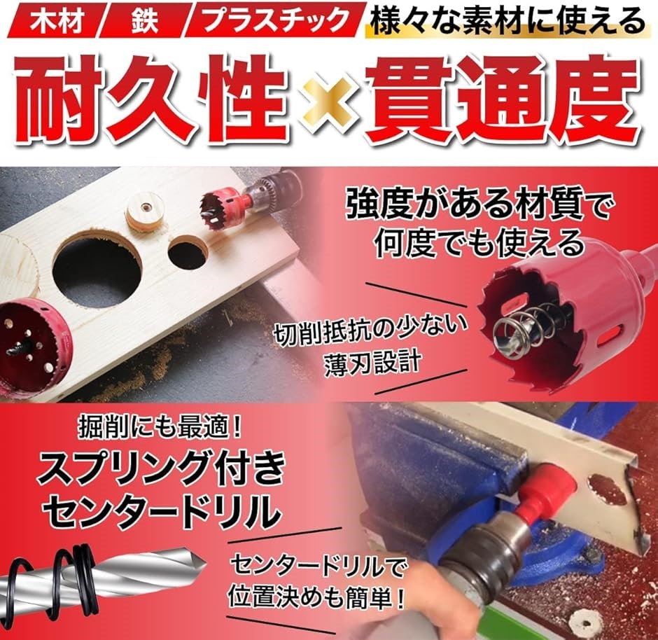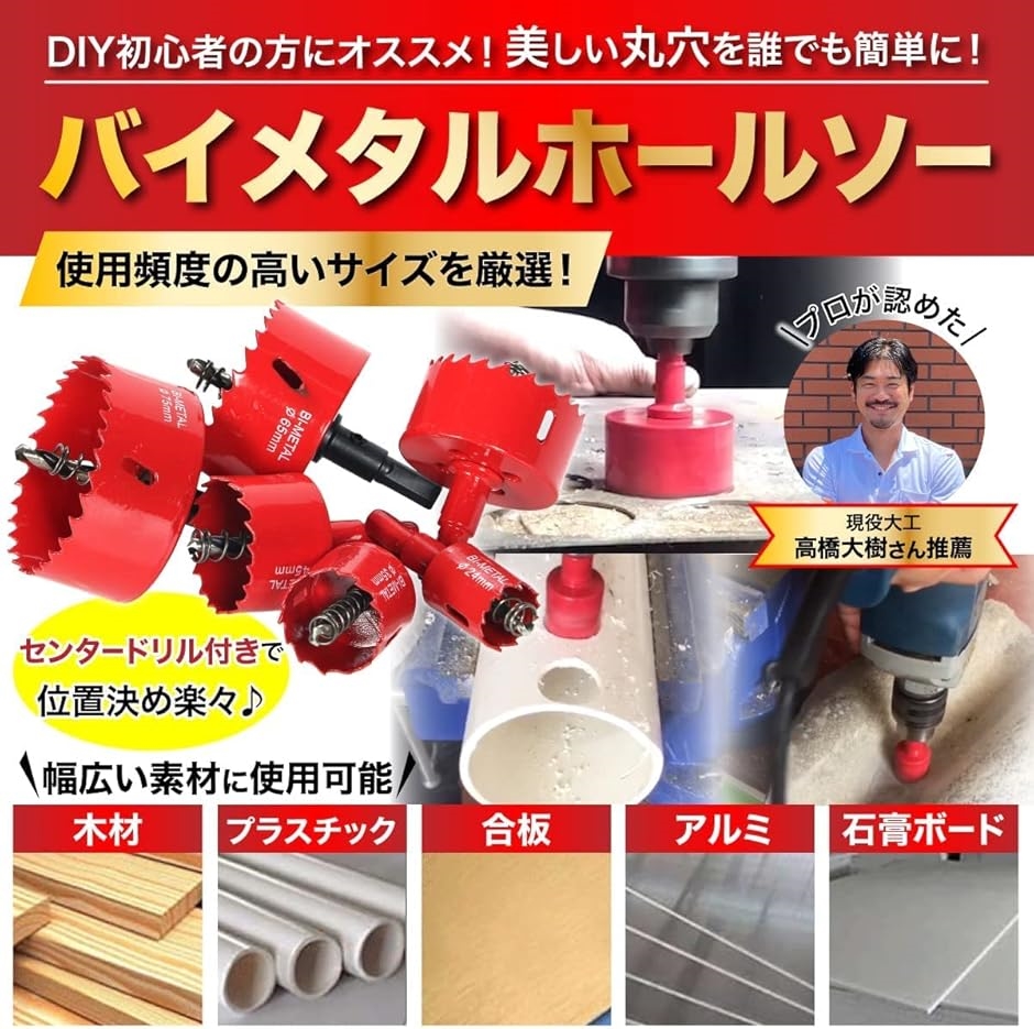 現役大工が推薦 バイメタル ホールソー ホルソー 穴あけ 切削 工具(レッド, 60mm)