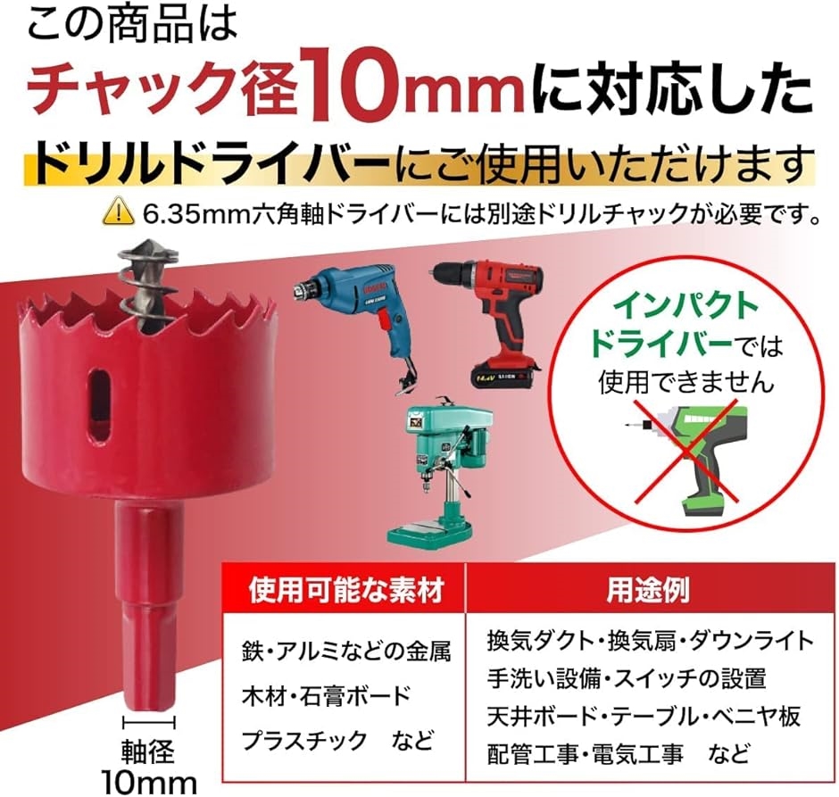 「使用頻度の高いものを厳選」アルミ板、鉄板、木材、プラスチック、石膏ボードなどの穴あけに