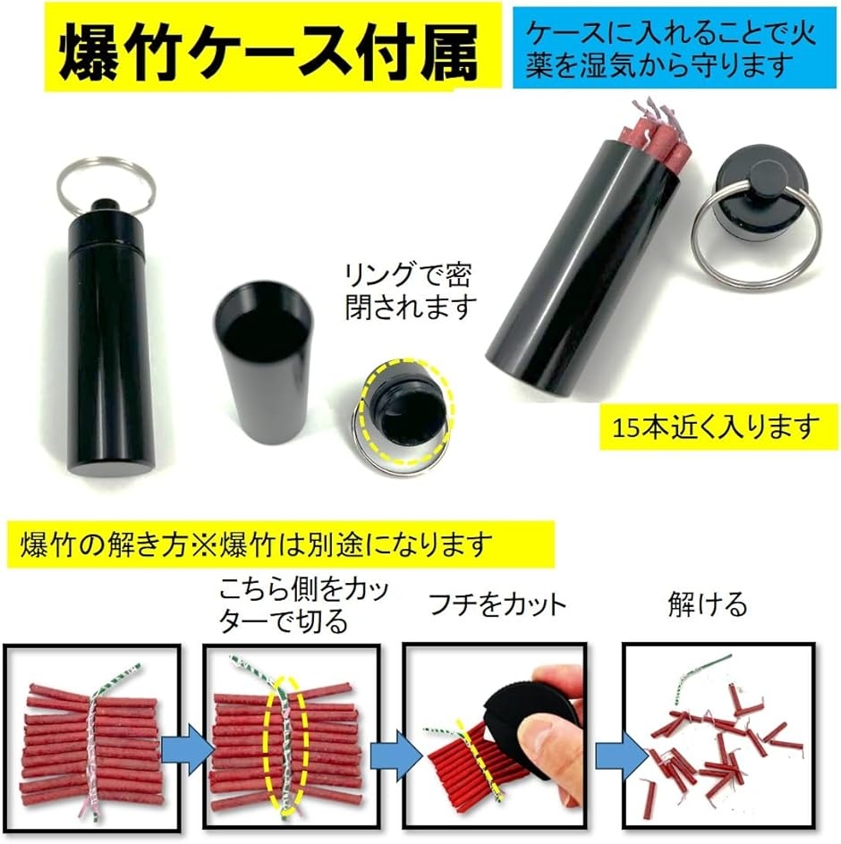 「爆竹ケース付き」湿気に弱い爆竹を不意の雨から守り、15本程度を長期間安全に保管できる、密閉性の高い専用ケース付きです。