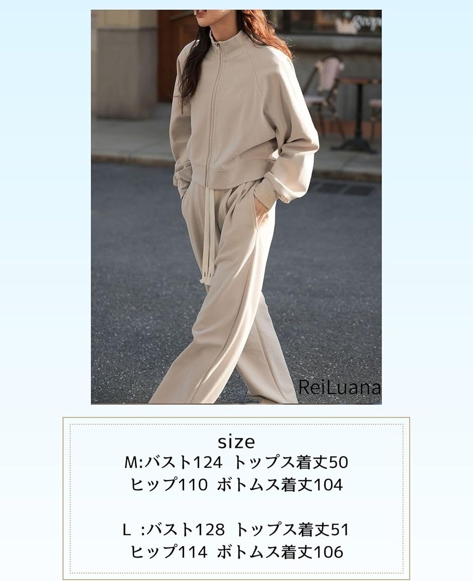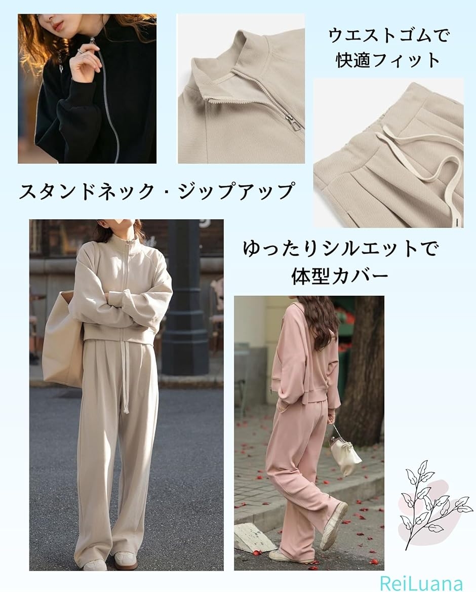 「ジャージ 上下 レディース」「スウェット セットアップ」「ゆったり シルエット」を意識したおしゃれなカジュアルスタイルです。