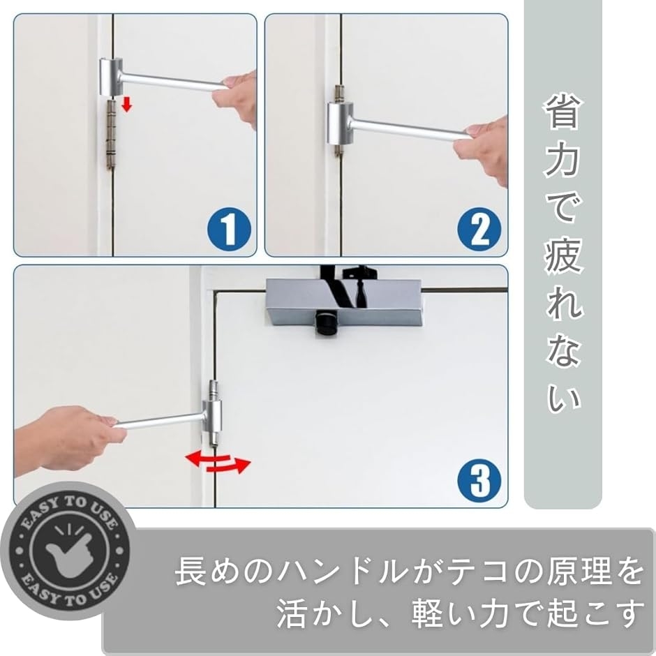 垂れた扉も数回の操作で水平に戻り、腕力に頼らずどなたでもスマートに補修できます。