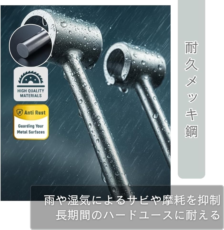 「耐久メッキ鋼」厚肉の鉄製ボディ表面に亜鉛メッキを施し、雨や湿気によるサビや摩耗を抑制。