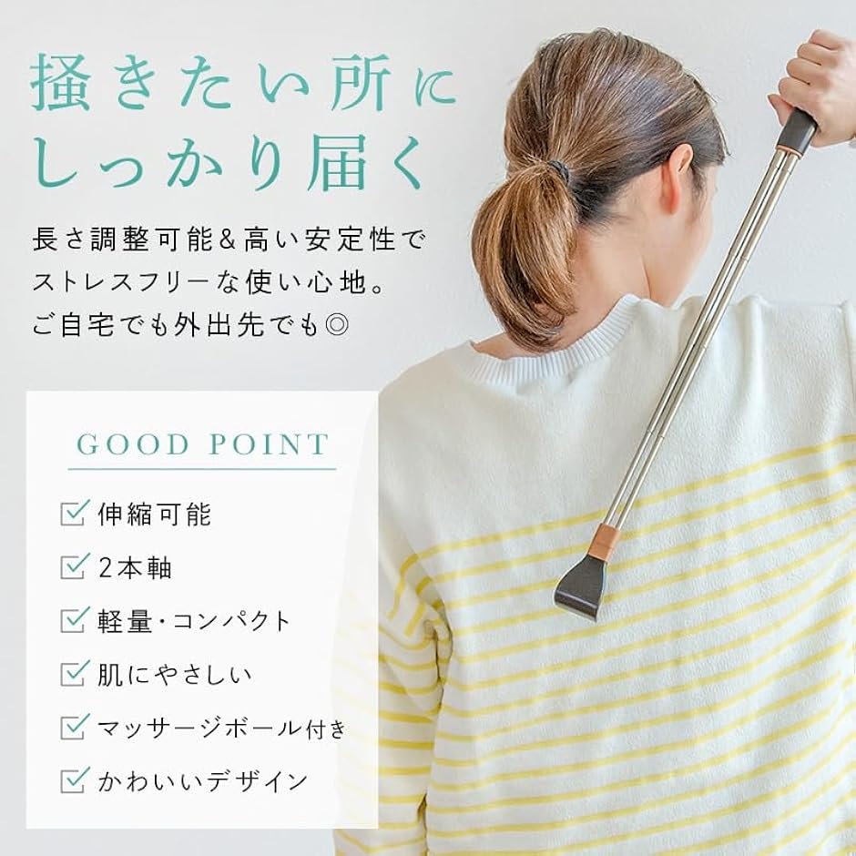 背中をかく以外にも肩や腰のツボ押しにも使える2WAY仕様で便利です。