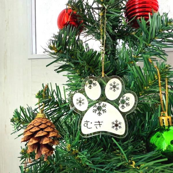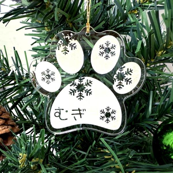 【名入れ】ワンにゃん肉球オーナメント*アクリルタイプ クリスマス プレゼント ギフト 犬 ネコ クリスマスツリー 刻印 透明 クリア シンプル ホワイト 結晶