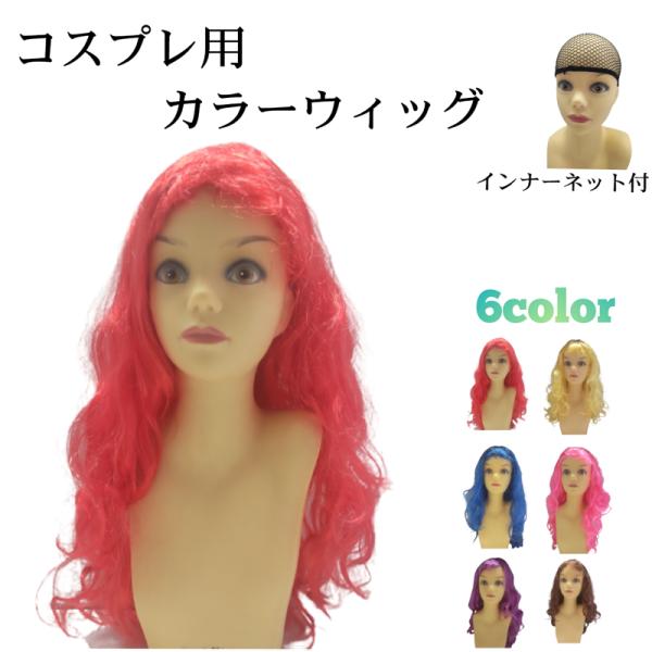カラーウィッグ ロング ウェーブ オールウィッグ フルウィッグ ハロウィン イベント 仮装 コスプレ コミケ WIG かつら カツラ ブラウン 赤 ピンク 青 紫 黄色