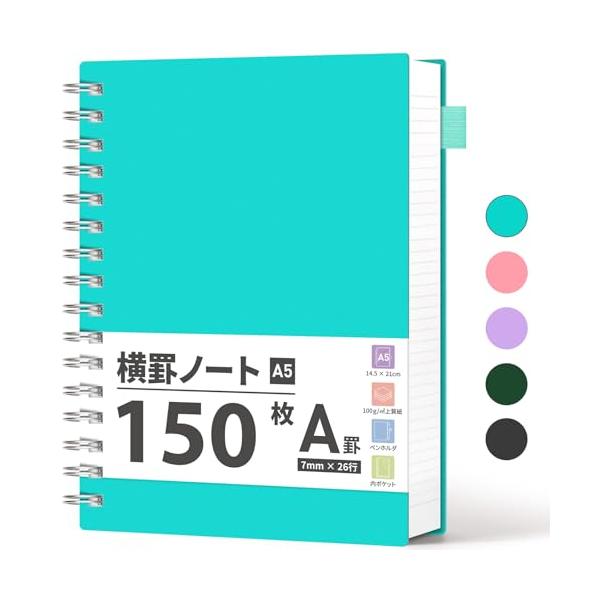 AHGXG ノート メモ帳A5 リングノート 横罫(A罫7mm)、100GSM 150 枚、サイズ:横 14.6cm× 縦 21.3cm、100
