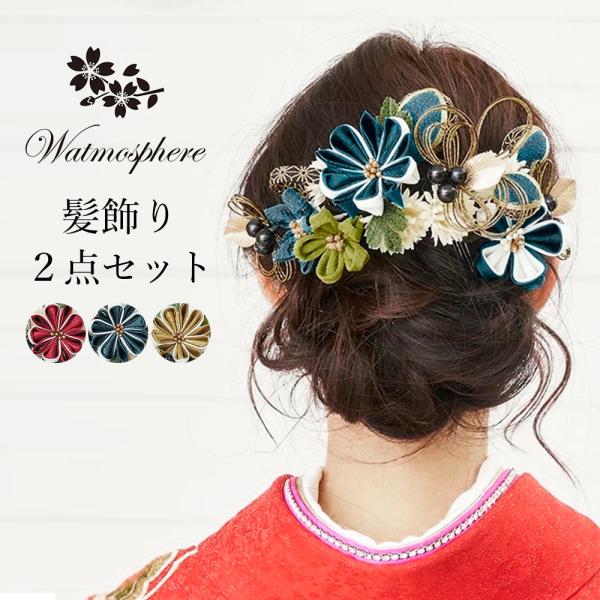 Watmosphere 髪飾り 成人式 和装 花 卒業式 袴 振袖 着物 つまみ細工 コーム uピン 2点セット