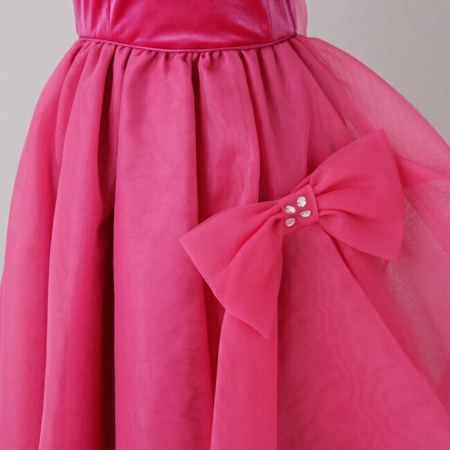 色のはっきりとしたローズピンクの舞台映えするドレスです。胸元にはライトを浴びてキラキラするようにラインストーンのビジューを取りばめました。スカートもボリュームのあるオーガンジーのフンワリスカート。濃い色ですが、比較的どなたにでも似合う色味です。