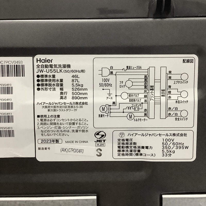 再生品 全自動洗濯機5.5KG アッシュBK B品 JW-U55LK(AK) 送料無料 アウトレット品 リファービッシュ品 82-5R51033E