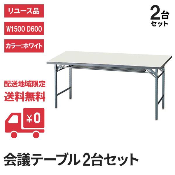 会議テーブル 折りたたみ ホワイト ラバーエッジ 幅1500×奥行600mm 2台セット 完成品 設置込 中古 地域限定送料無料