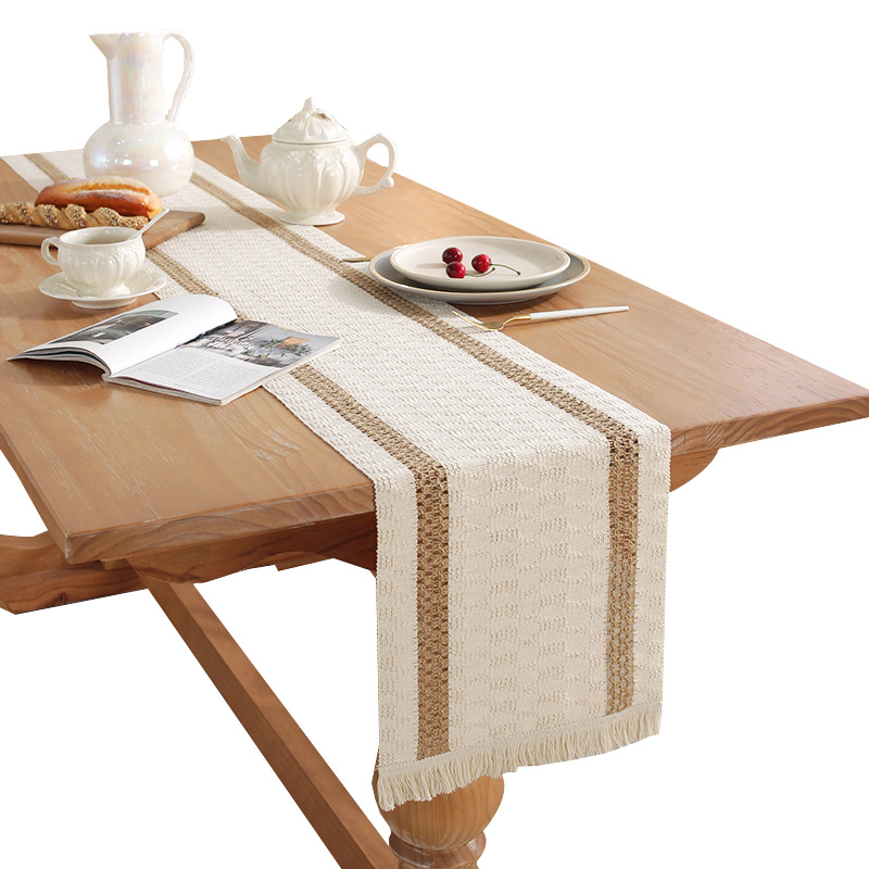 テーブルランナー、テーブルフラッグ、コットンリネン、北欧風、ナチュラル、ジャカード、フリンジ、おしゃれ、インテリア、カフェ風、ダイニング、リビング、デスク装飾、布小物、ギフト