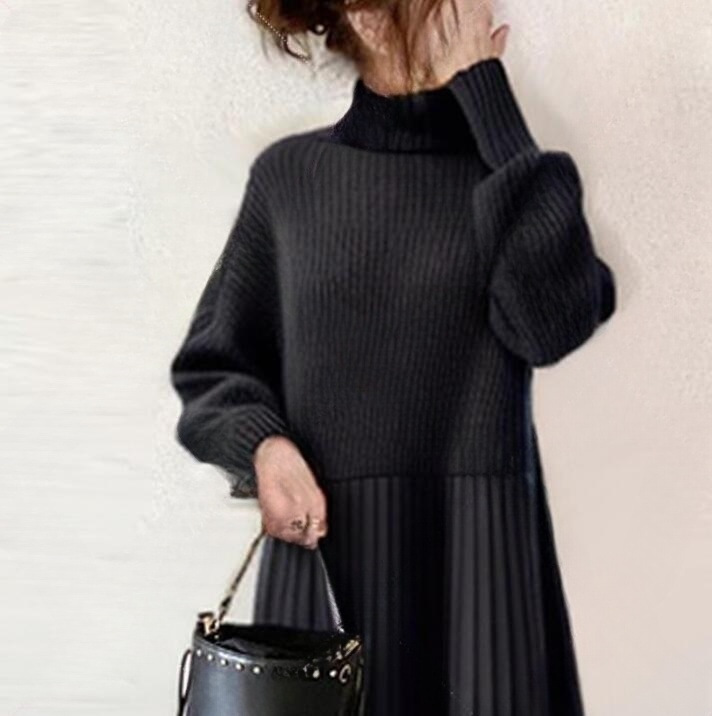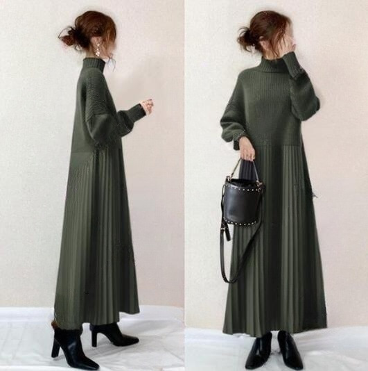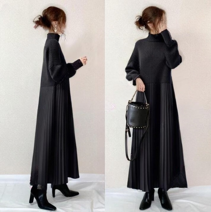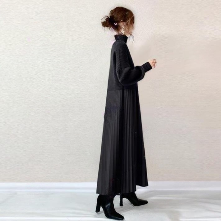 ワンピース、ロング、秋冬、プリーツ、ニット、Aライン、ブラック、カーキ、ゆったり、体型カバー、上品、きれいめ、通勤、旅行、デイリー、レディース