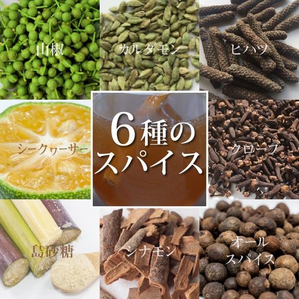 沖縄県産のシークヮーサー、沖縄で昔からつたわるスパイス「ヒハツ」をはじめ数種類のスパイスとハーブを独自ブレンドし、沖縄県&鹿児島県産の国産サトウキビから作る精製をおさえた自然な茶色の島砂糖でナチュラルな甘みを加えました。