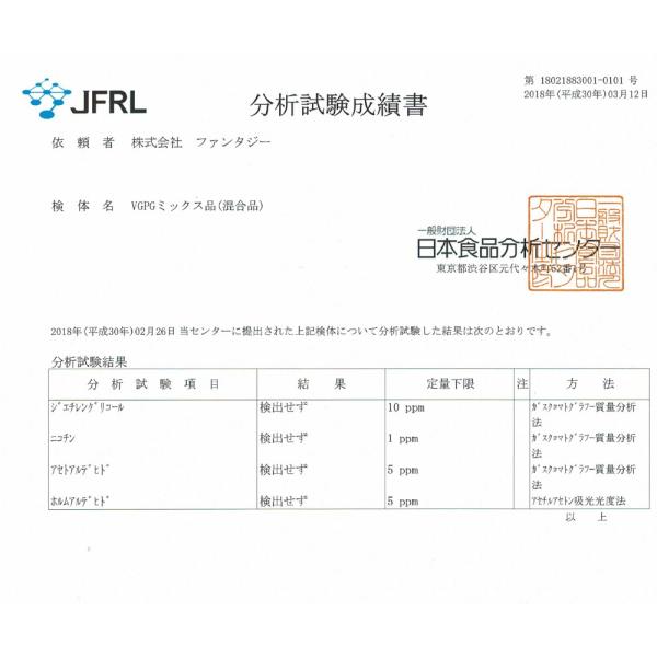 ファンタジーのVGPGミックス品(混合品)は、日本食品分析センターで分析試験を実施しておりますので安心してご利用頂けます。
