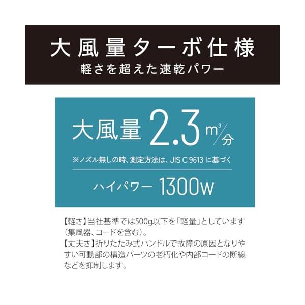 ・大風量2.3m/分で高速乾燥、腕が疲れない軽量約460g