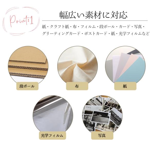・紙、クラフト紙、布、フィルム、段ボール、写真など幅広い素材に対応