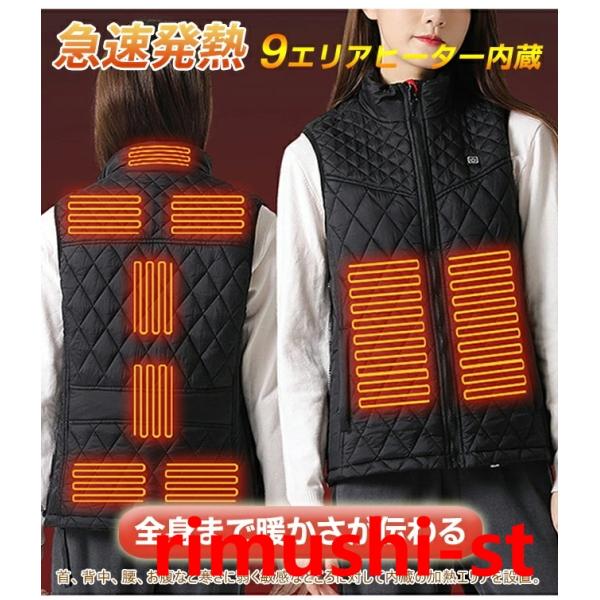 電熱ベスト レディース 9エリア 9つヒーター付き ヒーターベスト USB充電式 3段階温度調節 ジャケット 発熱 加熱服 加熱ベスト 中綿ベスト 電熱インナー 洗濯可