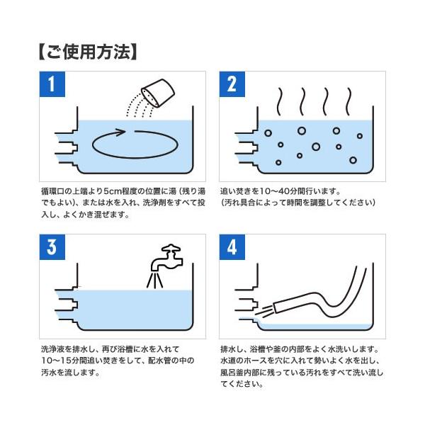 3. 終了後、洗浄液を排水してから再度浴槽に水を入れて、もう一度10分〜15分間追い焚きをして循環経路の汚水を流して下さい。