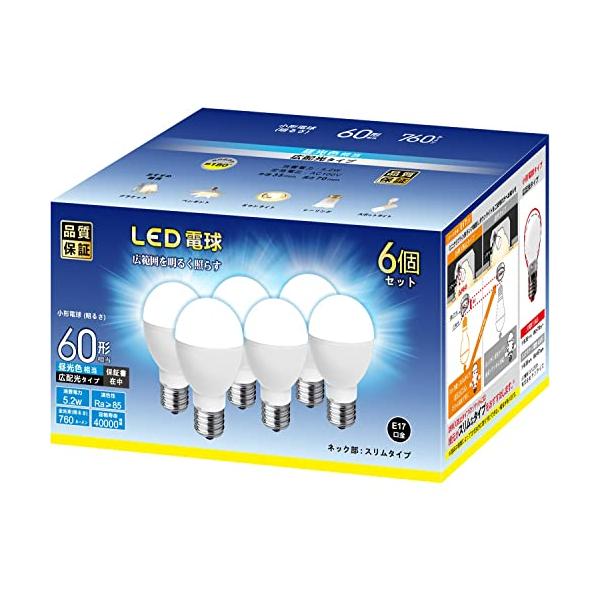 LED電球 E17口金 60W形相当 760lm 昼光色 5W ミニクリプトン型 小形電球 高輝度 広配光 密閉器具対応 6個セット