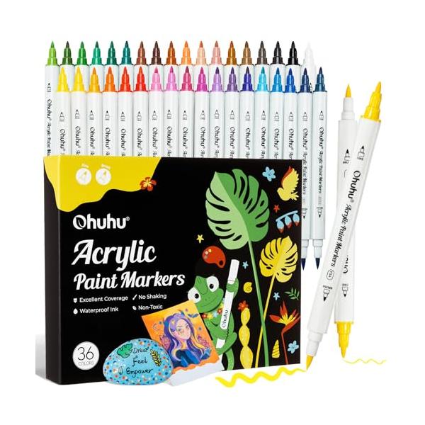 Ohuhu アクリルマーカー 筆タイプ・細字 36色セット アクリルペン 中綿式 不透明水性ペン ペイントマーカー 木材 石 布 金属 ガラス 陶器 DIY 学校 プレゼント