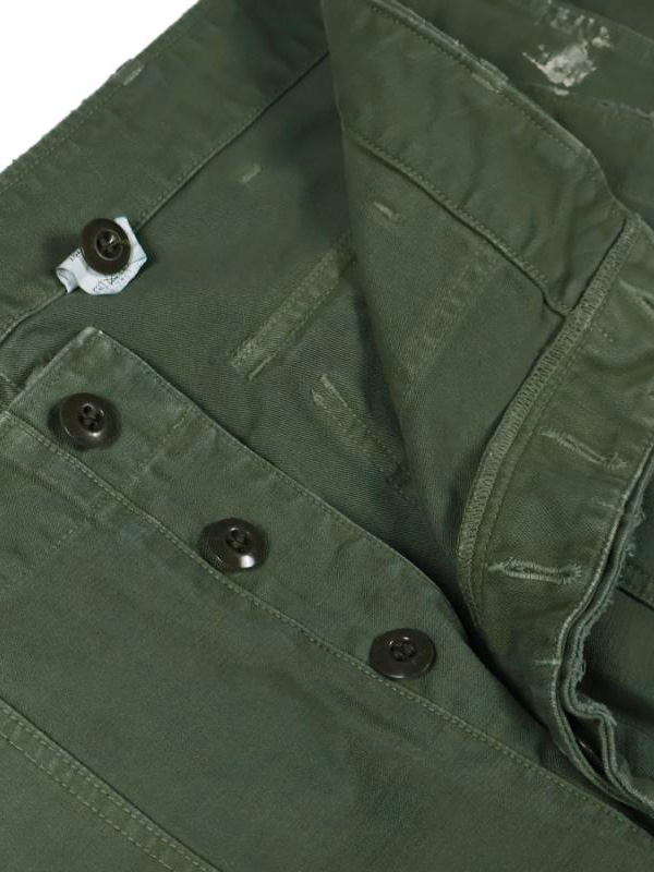 定番ユーティリティートラウザーのダメージ加工。