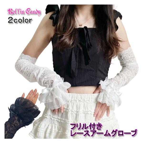 フリル付き レース アームグローブ/アームカバー/アームウォーマー/手袋 フィンガーレス ロリータ ゴスロリ 衣装 ダンス 衣裳 レディース 黒 白 ライブ 付け袖