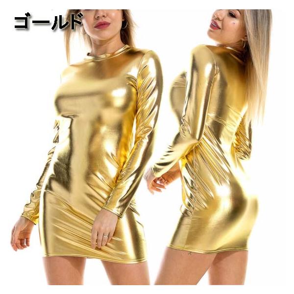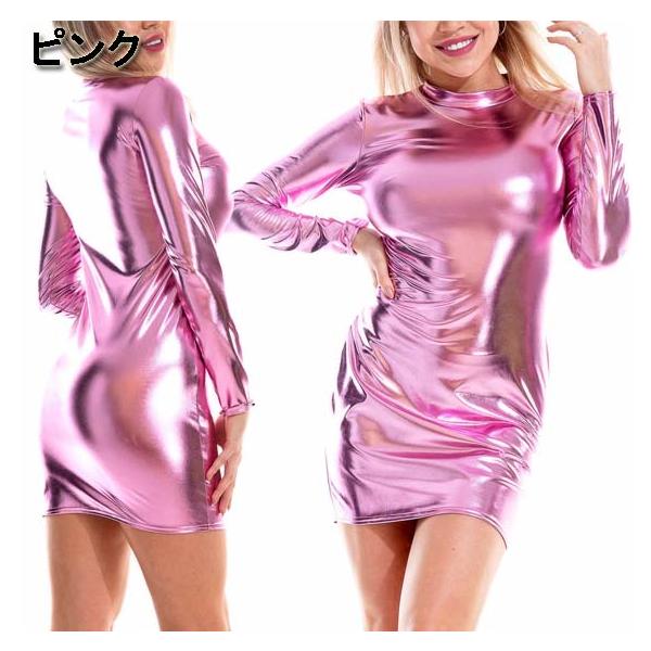 ダンス衣装・ステージ衣装に!メタリック 長袖 ハイネック ワンピース ボディコン ミニワンピ ロングスリーブ レディース 派手 ヒップホップ キラキラ エナメル