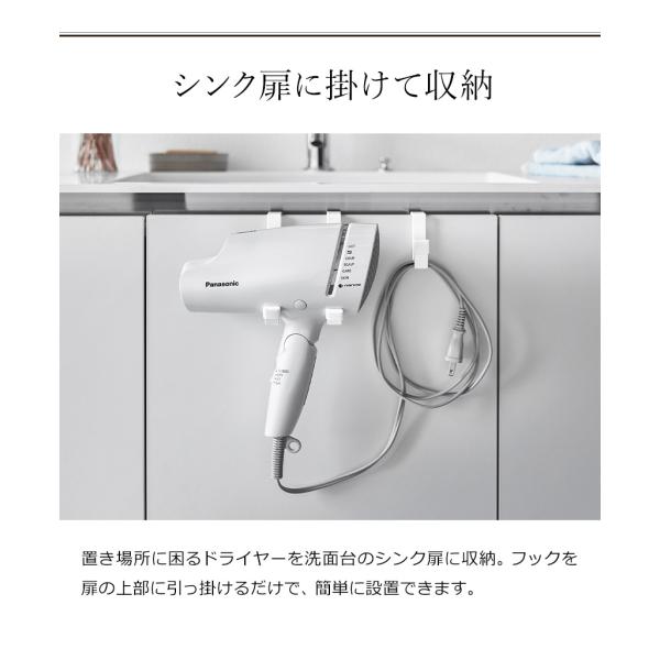 毎日使うヘアドライヤーを手に取りやすい位置にスタンバイできる『 tower( タワー )ドライヤーハンガー 』。ハンガーのフック部を洗面シンク扉の上部に掛けて取り付けて、ドライヤーを省スペースに収納できます。絡まりやすいコードをまとめられるコードホルダーが付いているのも◎。ハンガー部の内側に貼ってドライヤーの傷つきを防ぐための緩衝材も付属しています。“ヤマジツ”の愛称で親しまれる山崎実業は、「くらしを整える」商品を提案し続けています。
