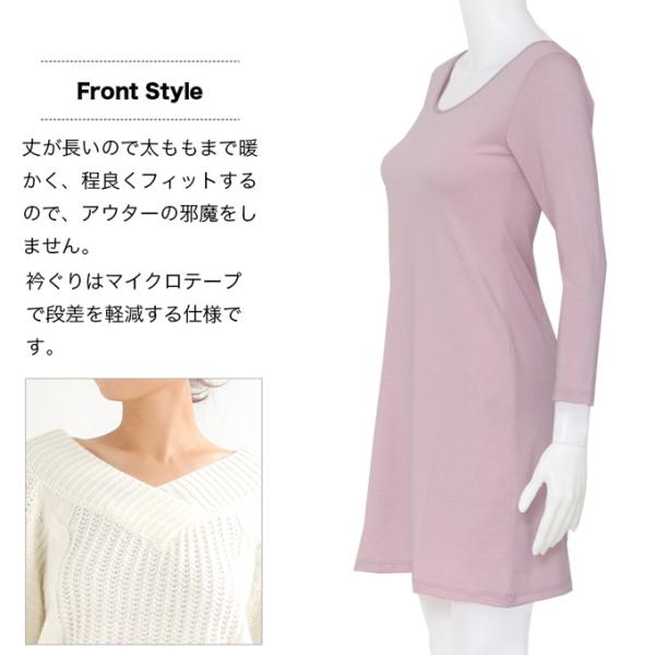 丈が長いので太ももまで暖かく、程良くフィットするので、アウターの邪魔をしません。衿ぐりはマイクロテープで段差を軽減する仕様です。