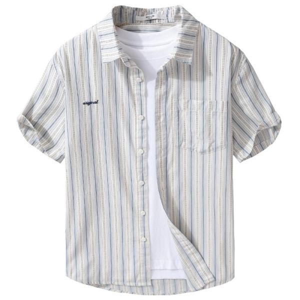 メンズ 半袖シャツ カジュアルシャツ サマーシャツ ストライプ柄 シンプル 薄手 軽量 折り襟 夏服 ゆったり シャツアウター 胸ポケット