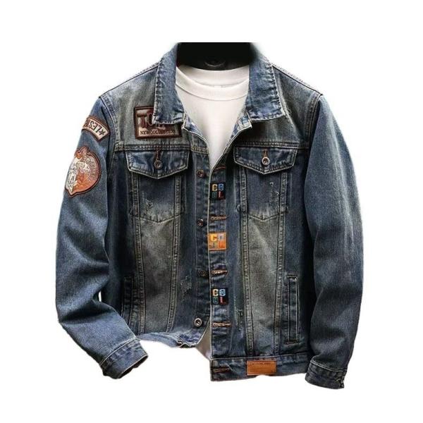 デニムジャケット 刺繍 ワッペン ジージャン メンズ 折り襟 ワークジャケット バイクウェア アメカジ ヴィンテージ風 厚手 耐磨耗 春秋