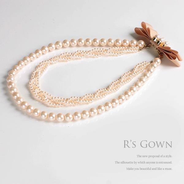 艶、色、質感のよいパールを使用、大粒9mmのグラスドパールに3mmのプラスチックパールが3連で編まれた、ダブルパールネックレス。内側小粒のパールが取り外せ、一連での使用も可能、普段使いにもお勧めできるネックレスです♪リボンの適度なボリュームとシルエットは後ろ姿もチャーミングな印象で、優しい印象のデコルテラインに導きます。