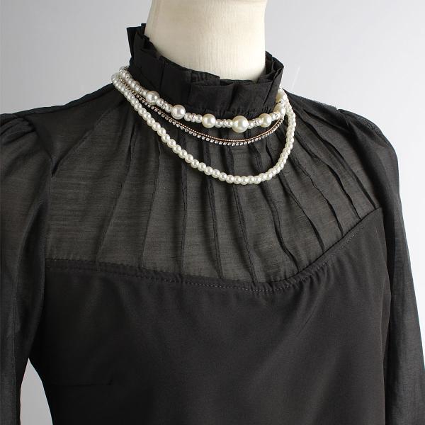 パール&ビジューが重なるレイヤードはシルエットを縦のラインへ導く優れもの。清潔感ある品のいい印象をお顔周りに。