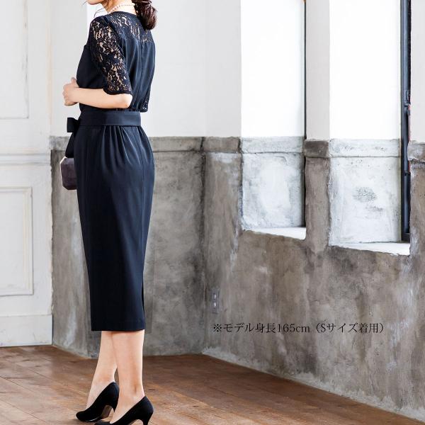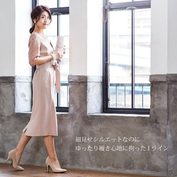 すっきり細見え大人シルエットのIライン ワンピース。5分丈のレース袖、膝下よりちょっと長めのスカート丈、スカートのシルエットに拘り、ゆとりある着心地、足元へ向かいすっきりとした印象にデザイン。パンツデザインで定評を頂いているポインティーデコルテ・シリーズになります。(パンツ:FD-1972305)