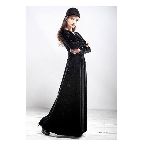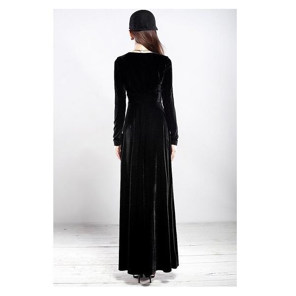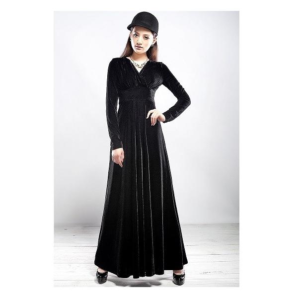 Vネック ベロア ハイウエスト ロング ドレス (黒)マキシ丈 カシュクール ワンピース パーティー