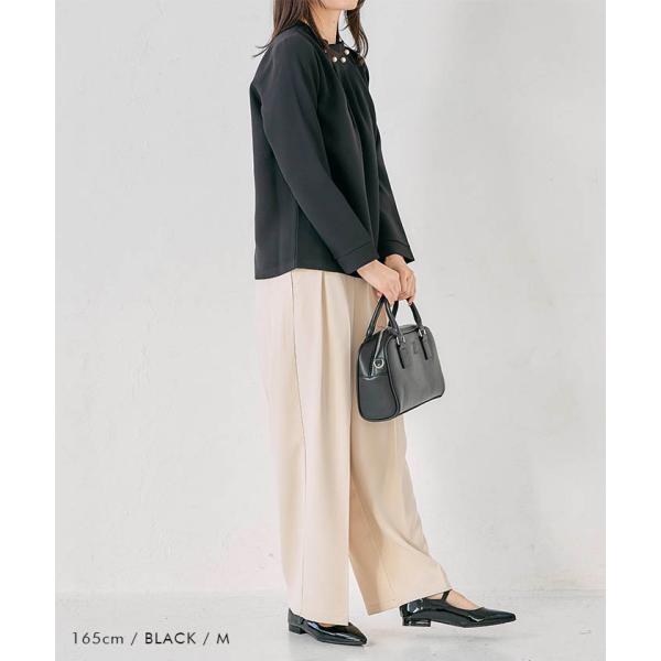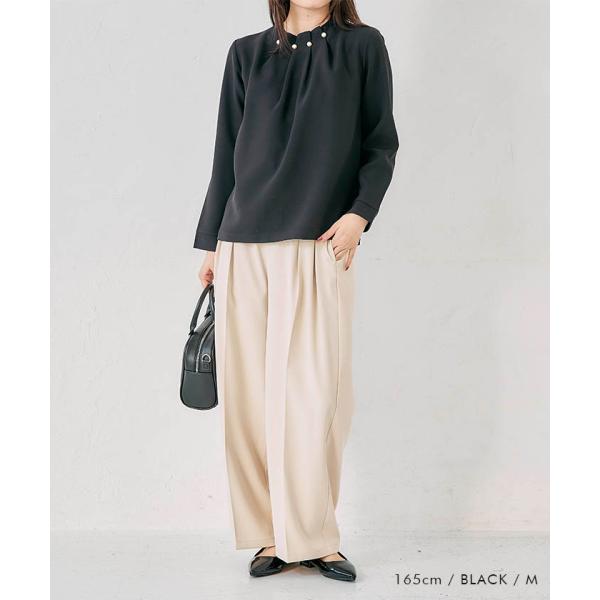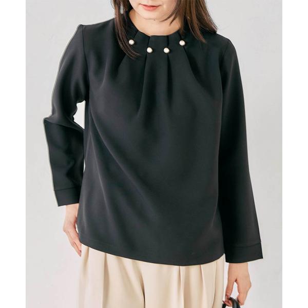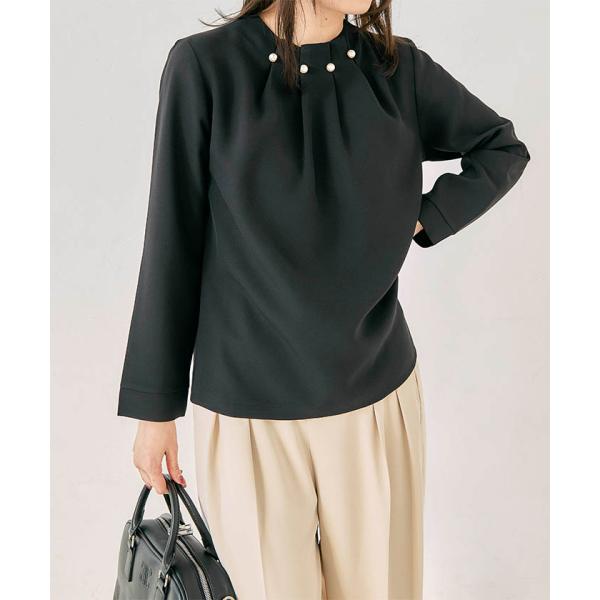 首元のタックとパールが目を惹くパールネックブラウス。