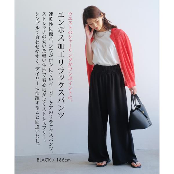 ウエストのシャーリングがワンポイントに。エンボス加工リラックスパンツ 。